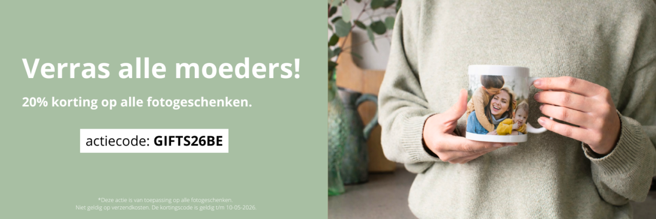Nieuwe actie! 20% korting op alle fotogeschenken De actiecode is GIFTS26BE Maak nu tijd om jouw attentie te maken en bestel met 20% korting. Actie van 13/04 t.e.m. 10/05/2026. De actiecode is 'GIFTS26BE'. Bestellen via www.fujiprint.be & GRATIS afhalen in de winkel. Mis het niet en start vandaag nog!